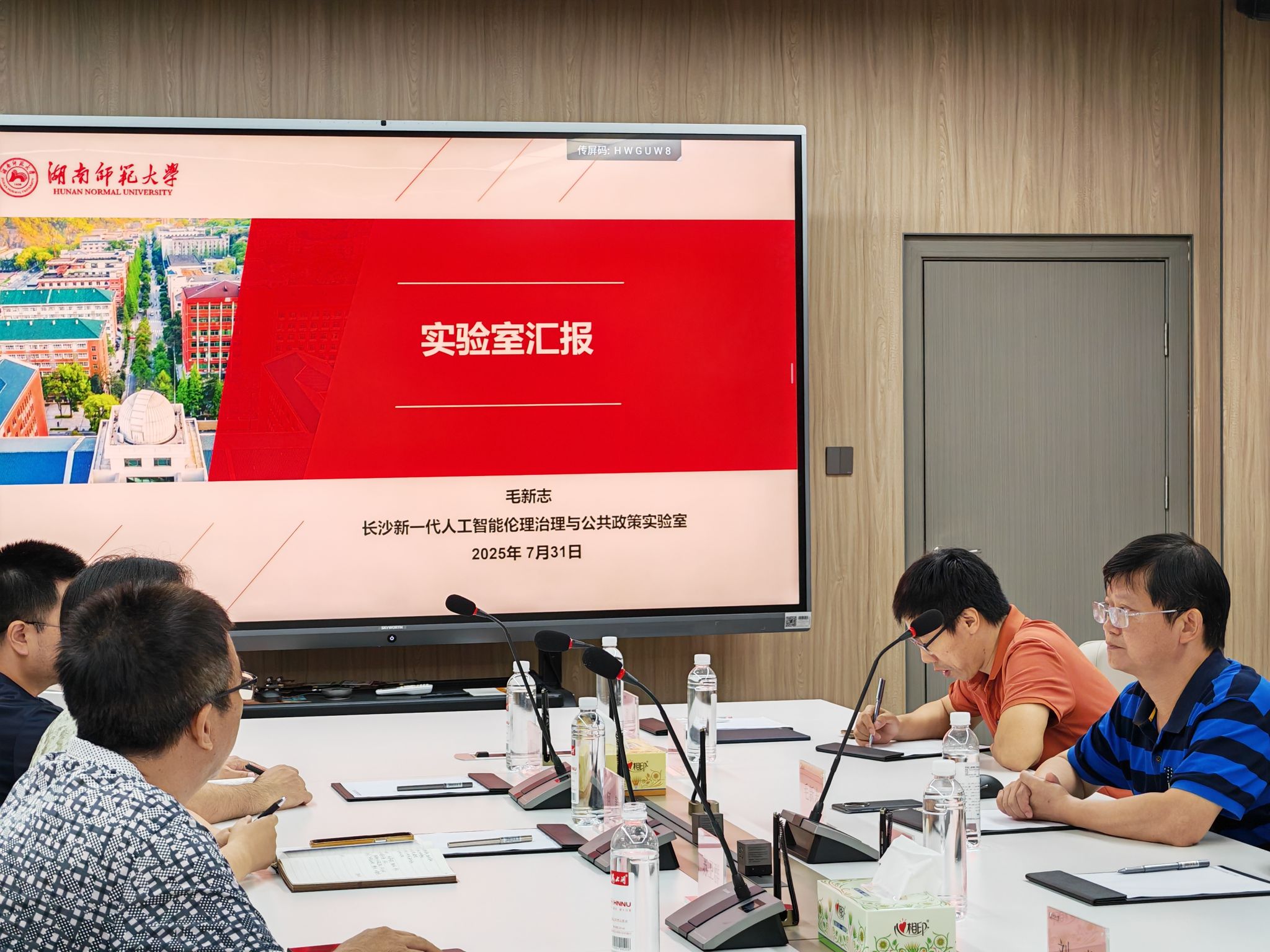 (通讯员:周航)2025年7月31日上午,长沙市科技局科技监督与诚信建设处处长何静、副处长苏卫群,市科技局计算与人工智能技术发展处处长罗汉果一行莅临长沙新一代人工智能伦理治理与公共政策实验室视察指导。视察期间,实验室执行主任毛新志主持召开长沙新一代人工智能伦理治理与公共政策实验室与长沙市科技局的双边座谈会,共同研讨实验室建设验收进度的相关工作,实验室全体成员参与座谈。会议伊始,实验室执行主任毛新志就实...